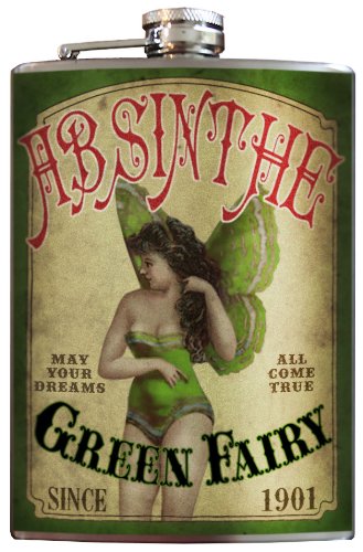 See the green fairy! Drink with my "Green Fairy Absinthe" flask. I love Victorian Absinthe labels; so creepy and cool. Here's my version on a handy hip flask.